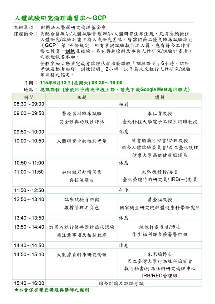 課程簡介:為配合醫療法/人體試驗管理辦法/人體研究法等法規,凡有意願擔任人體研究/試驗計畫主持人或研究團隊,皆需依藥品優良臨床試驗準則(GCP)第14條規定,所有參與試驗執行之人員,應有符合工作資格之教育、訓練及經驗。另有興趣瞭解及參與人體研究/試驗計畫者,均歡迎報名參加。全程參加活動並完成考試評估者核發課程「訓練證明」6小時,認證考試及格者加發「訓練證明」2小時,以作為未來執行人體研究/試驗等資格之認定。